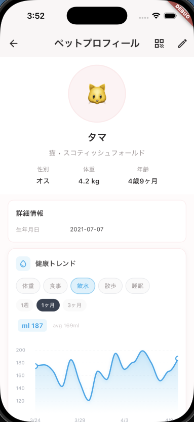 食欲・飲水量・睡眠・行動など、日々の習慣ログを診察前に把握。より的確な判断が可能になります。